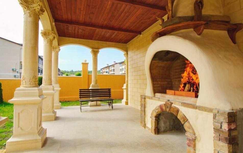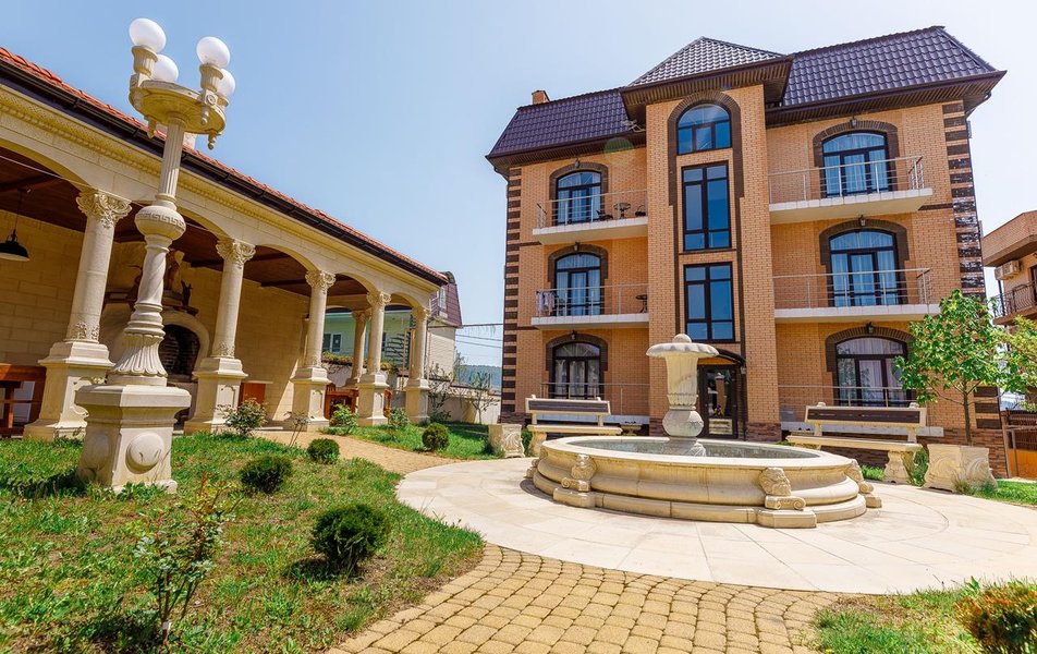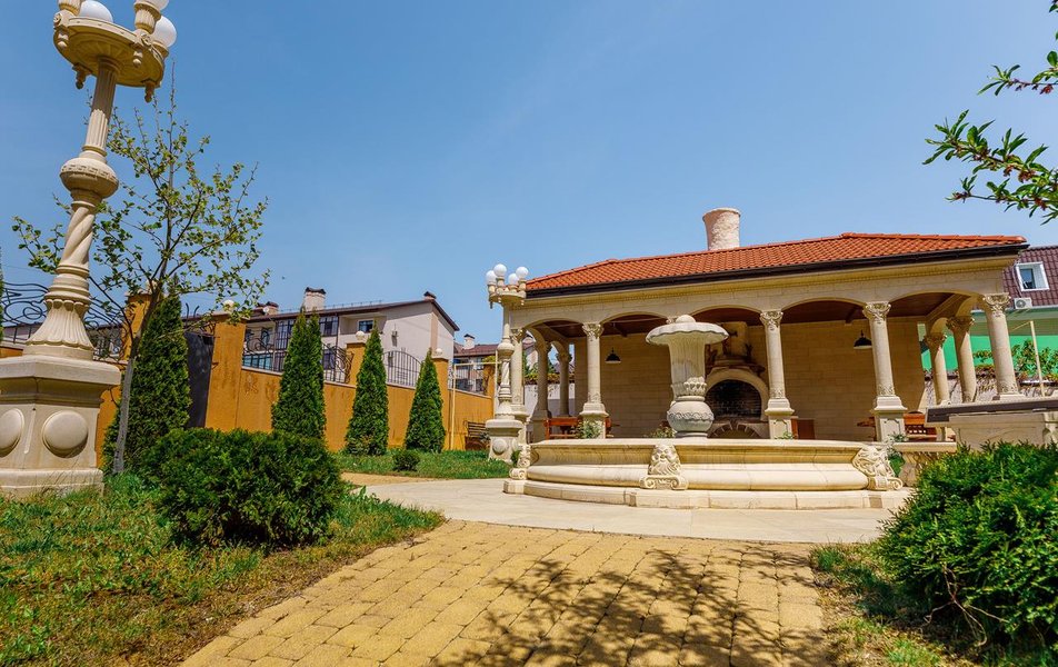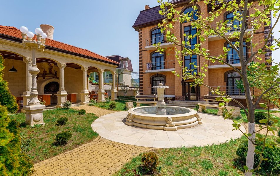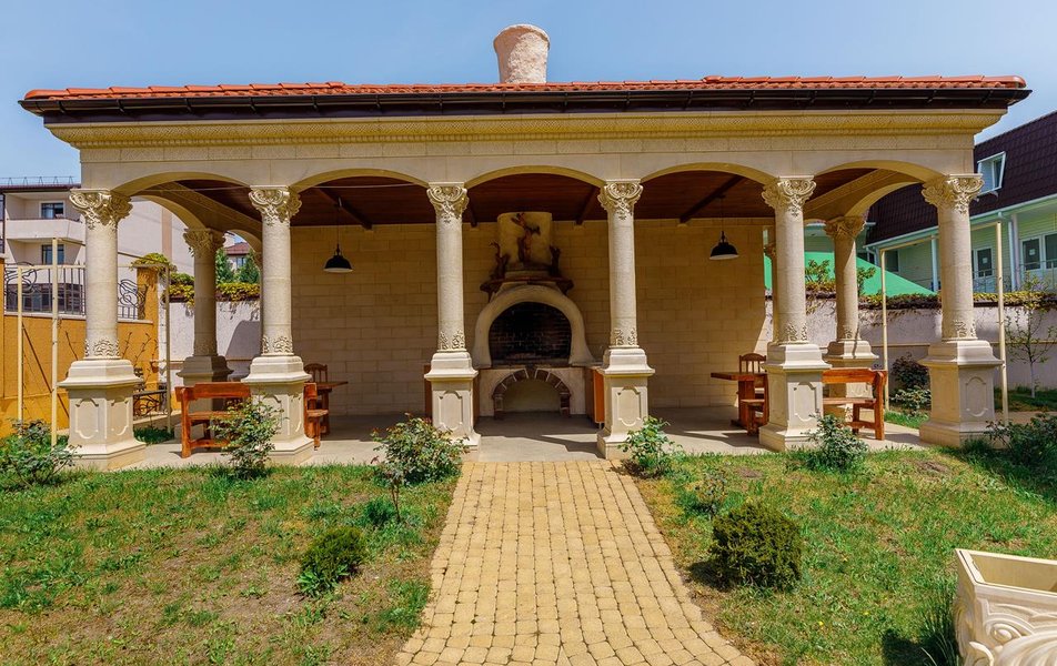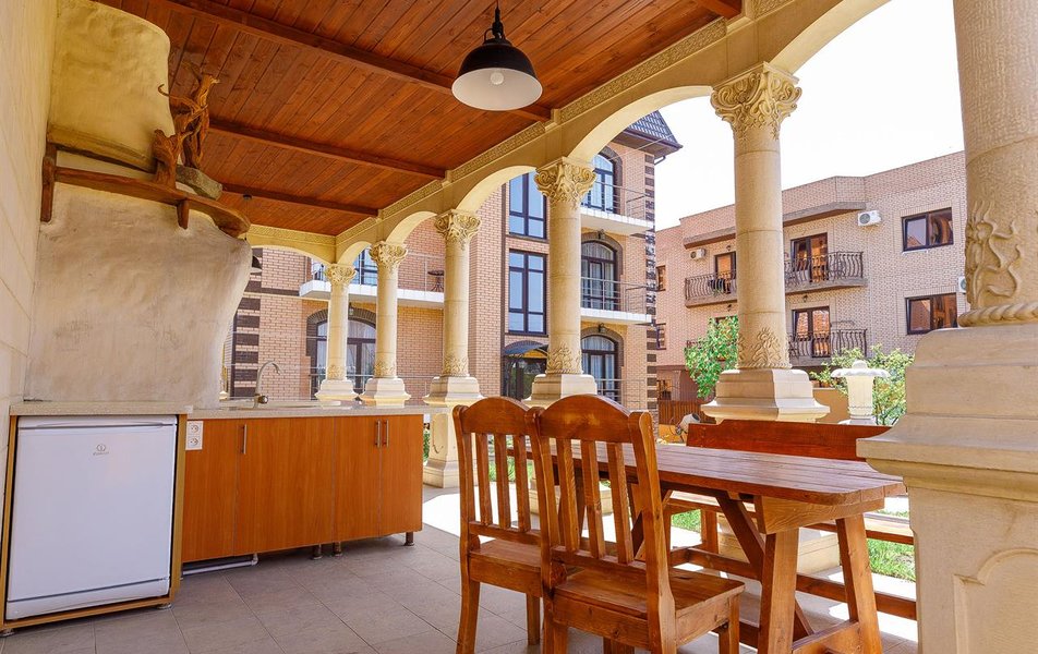 Во внутреннем дворике оборудована терраса для отдыха и мангальная зона для шашлыков. Среди услуг — прачечная и сеть wi-fi. До галечного пляжа — 300 метров. Пляж хорошо оснащен: на побережье есть раздевалки, навесы от солнца, шезлонги, работает спасательный пост. Фото:
