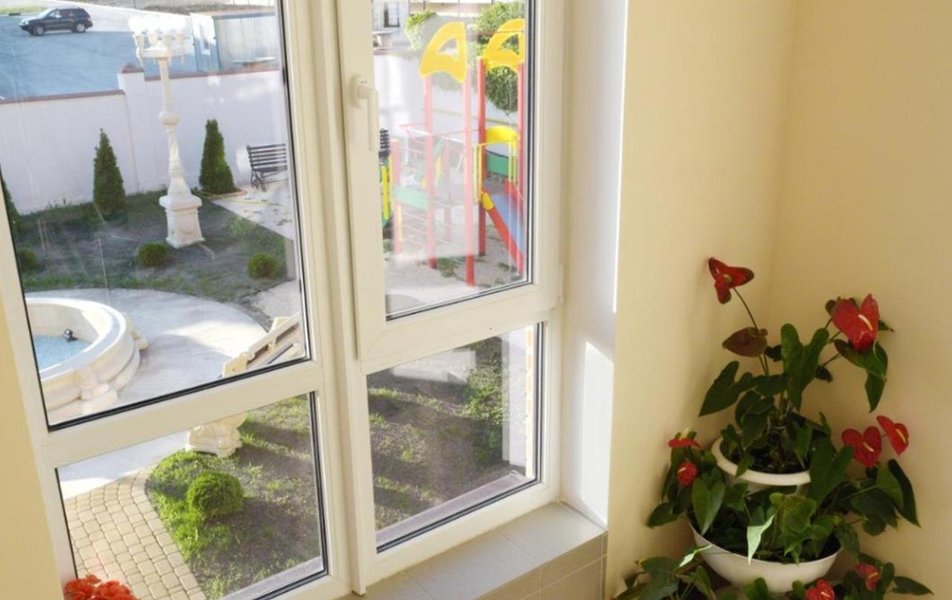 Трехэтажный кирпичный корпус находится на благоустроенной территории с садом, где установлены фигурные фонари и красивый фонтанчик в центре.Размещение: