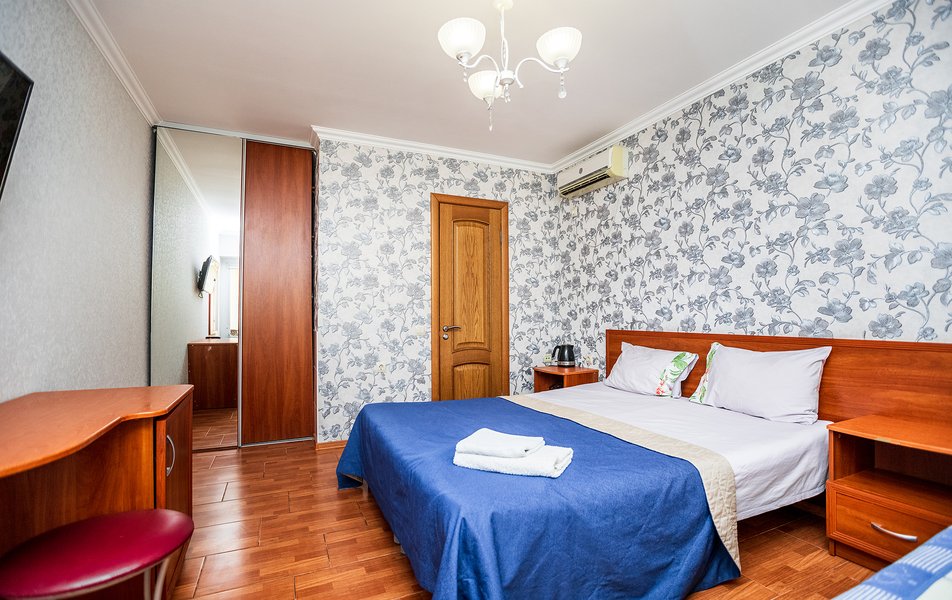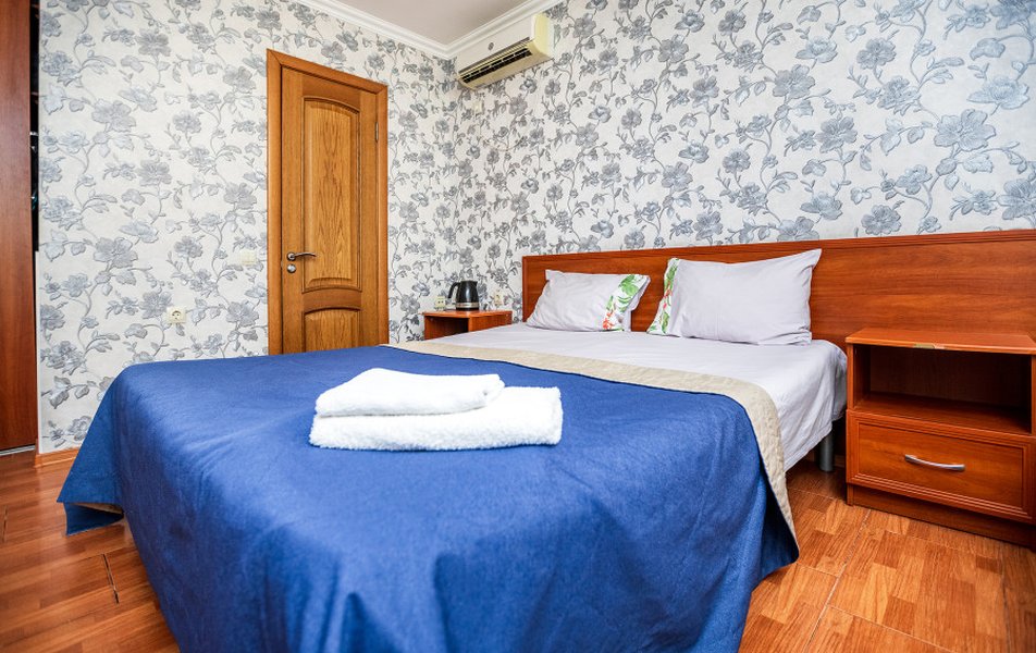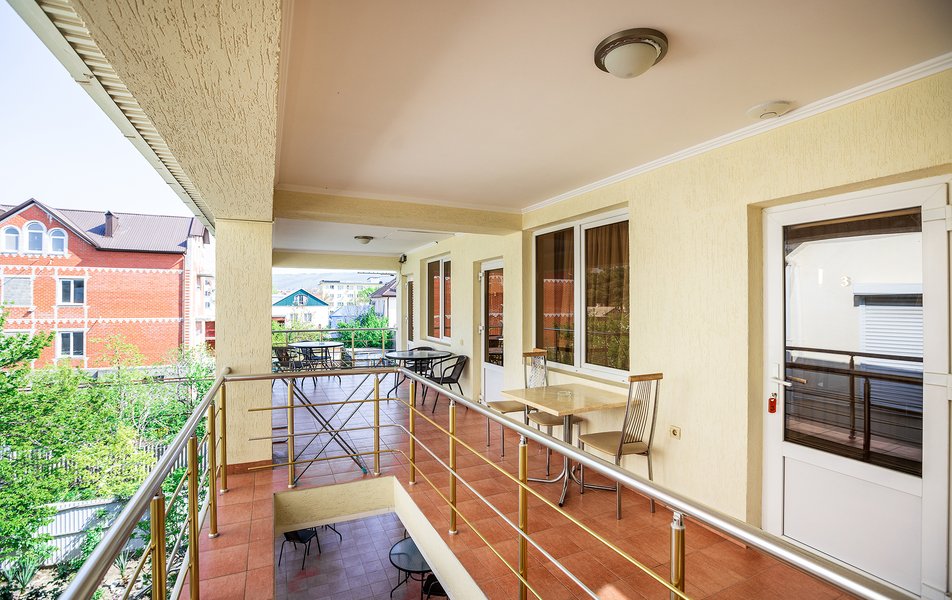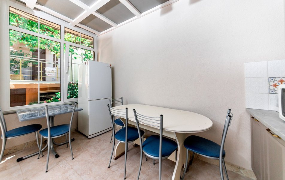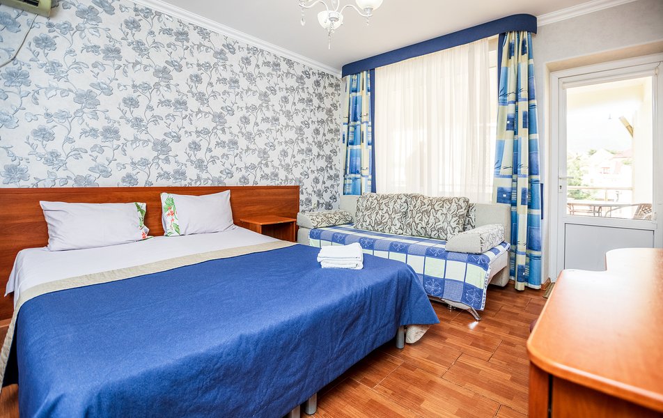 Комфорт 2-местный Площадь (кв. м) 20 Балкон с мебелью. Мебель: вешалка, диван, зеркало, кровати односпальные /одна двуспальная кровать, прикроватные тумбочки, стол, стул, шкаф. Оборудование: кондиционер, набор посуды, телевизор, холодильник, электрочайник. Санузел с душем, туалетные принадлежности, фен. Дом 4-местный 2-комнатный Тип номера Дом/домик Кол-во основных мест 4 Площадь (кв. м) 45 Мебель: вешалка, диван раскладной, зеркало, комод, кровать двуспальная, кухонная мебель, прикроватные тумбочки, столик журнальный , стол обеденный, стулья, тумба, шкаф. Мини-кухня. Оборудование: гладильная доска, утюг, кондиционер, микроволновая печь, набор посуды, плита газовая, стиральная машина, сушилка для белья, телевизор, холодильник, чайный набор посуды, электрочайник. Санузел с душем, туалетные принадлежности, фен. Дом 5-местный 2-комнатный Количество комнат 2-комнатный. Тип номера Дом/домик. Дополнительное место диван. Вид из номера на двор. Кол-во доп. мест 1. Кол-во основных мест 4. Площадь (кв. м) 50. Кухня. Мебель: вешалка, диван раскладной, зеркало, комод, кровать двуспальная: 2 , кухонная мебель, прикроватные тумбочки, столик журнальный, стол обеденный, стулья, шкаф. Оборудование: гладильная доска, утюг, кондиционер, микроволновая печь, набор посуды, плита электрическая, стиральная машина, сушилка для белья, телевизор, холодильник, чайный набор посуды, электрочайник. Санузел с душем, туалетные принадлежности, фен. Дом 6-местный 3-комнатный Тип номера Дом/домик. Кол-во основных мест 6. Площадь (кв. м) 50. Кухня. Мебель: вешалка, диван раскладной, зеркало, комод, кровать двуспальная: 2, кухонная мебель, прикроватные тумбочки, столик журнальный, стол обеденный, стулья, шкаф. Оборудование: гладильная доска, утюг, кондиционер, микроволновая печь, набор посуды, плита газовая, стиральная машина, сушилка для белья, телевизор, холодильник, чайный набор посуды, электрочайник. Санузел с душем, туалетные принадлежности, фен. Дом 7-местный 3-комнатный Дом с отдельным входом и своим двором для отдыха. Тип номера Дом/домик Кол-во основных мест 7. Площадь (кв. м) 60, Мебель: вешалка, диван раскладной, зеркало, кресло-кровать, кровать двуспальная: 2, кухонная мебель, прикроватные тумбочки, стол, столик журнальный, стол обеденный, стулья, шкаф. Мини-кухня. Оборудование: кондиционер, микроволновая печь, набор посуды, плита газовая, сушилка для белья, гладильная доска, утюг, холодильник, чайный набор посуды, электрочайник. Санузел с душем, туалетные принадлежности , фен . Сервис Wi-Fi бесплатно, смена полотенец, смена постельного белья, уборка номера. Питание: