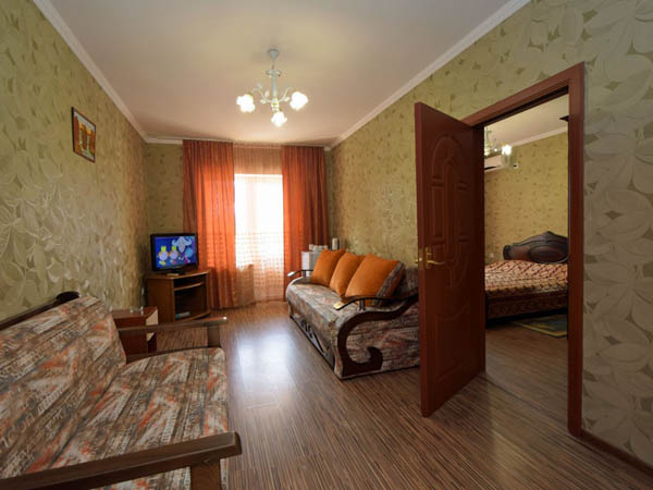 2-комнатный люкс: состоит из двух проходных комнат, одна из которых является спальней, а другая – гостиной. Каждый люкс имеет отдельный балкон, откуда открывается вид на центральную аллею. В номере: ТВ, холодильник, санузел, душ, кондиционер, электрочайник, фен. Доп. места- диван полуторный + диван двуспальный (макс. 6 чел. в номере).