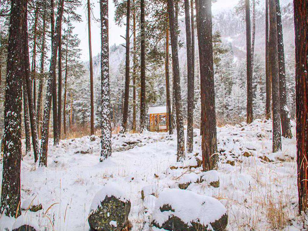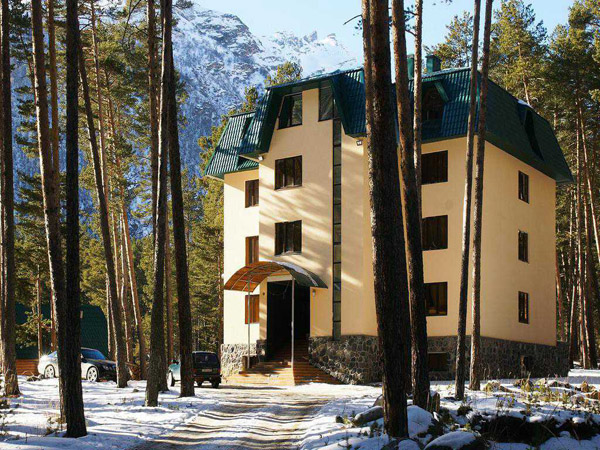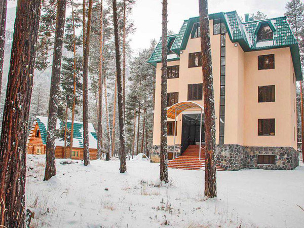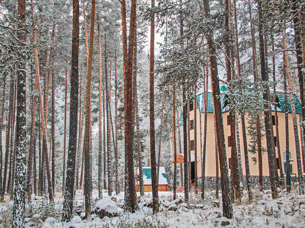 Отель "Сосновый бор" неспроста получил название, а заслуженно, ибо находится в сосновом бору. Отель окружают реликтовые сосны. Это говорит о том, что отель находится в уникально безопасном месте от схода лавин. С окон отеля открывается великолепный вид на гору Когутай (ледник Семёрка).