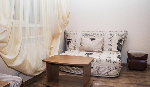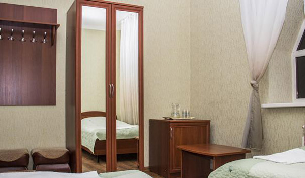 Однокомнатный трёхместный номер «П/люкс» 18 м². В номере: двухместная кровать, мягкая мебель, телевизор, шкаф, тумбочки, журнальный столик, пуфики. В душевой туалетные принадлежности. Максимально 3 человека.