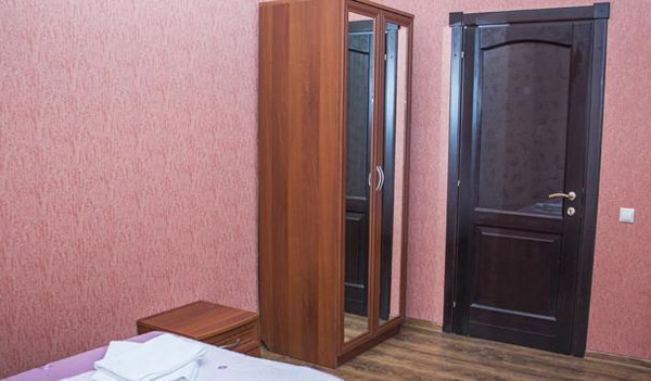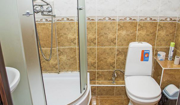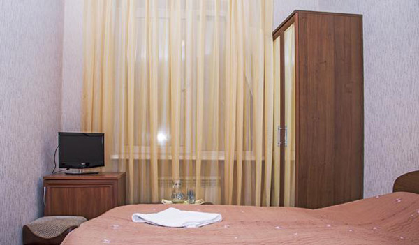 Однокомнатный двухместный номер «Стандарт» площадью 12 м². В номере: двухместная кровать (можно поставить отдельно), шкаф, телевизор, тумбочки, журнальный столик, пуфики, в душе туалетные принадлежности.