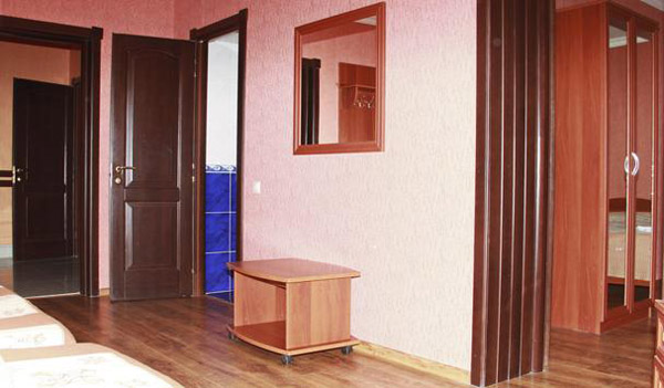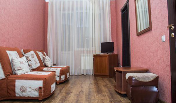 Двухкомнатный номер «Люкс» площадью 24 м². В номере: спальня с двухместной кроватью, шкаф, тумбочки. В гостиной телевизор, мягкая мебель, журнальный столик, пуфики, балкон, душ, туалетные принадлежности, фен. Максимально до 4 чел.
