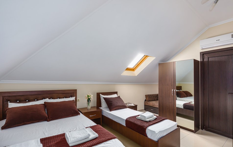3-местный мансардный (макс. 3+1 чел., 15 кв. м, телевизор, кондиционер, душ, фен, холодильник, 2-спальная кровать, 1,5-спальная кровать, санузел). Доп. место - кресло-кровать, предоставляется без ограничений по возрасту.