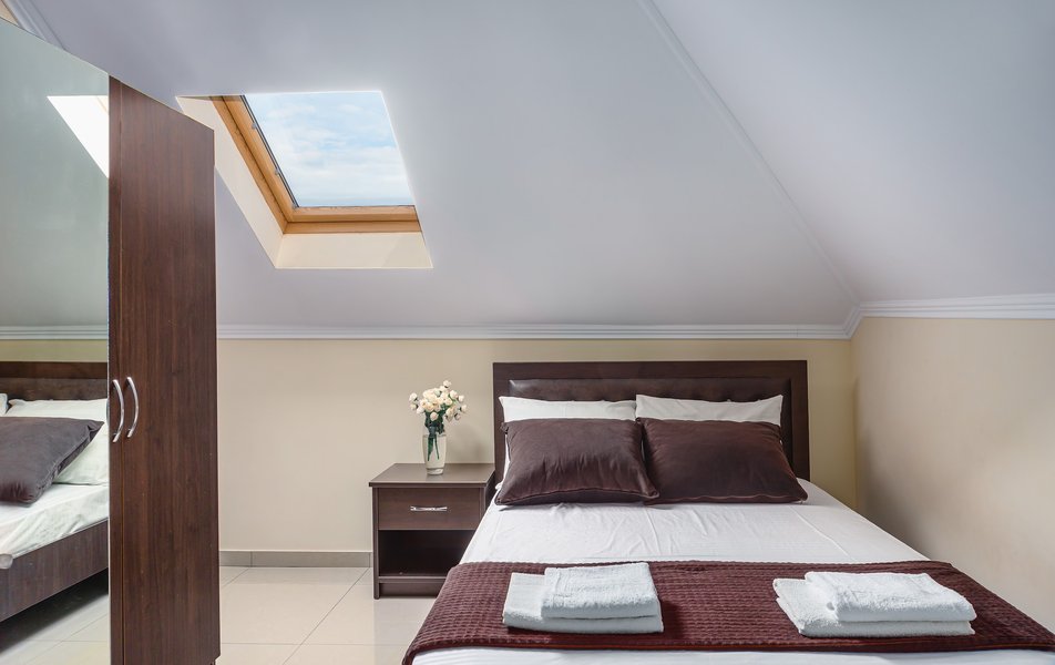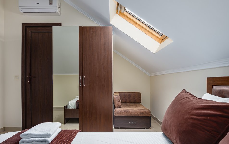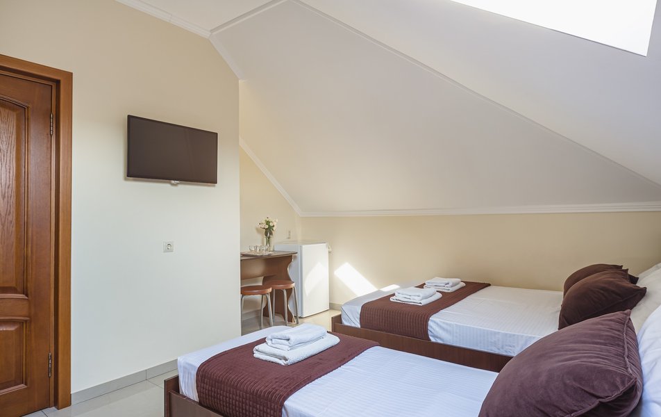 2-местный мансардный (макс. 2+1 чел., 13 кв. м, телевизор, кондиционер, душ, фен, холодильник, 2-спальная кровать, санузел). Доп. место - раскладной диван, одноместный, предоставляется без ограничений по возрасту.