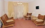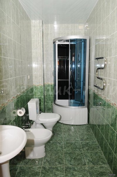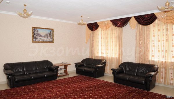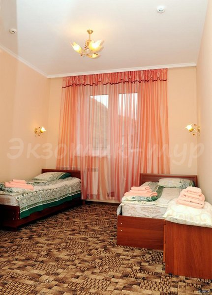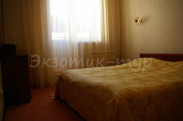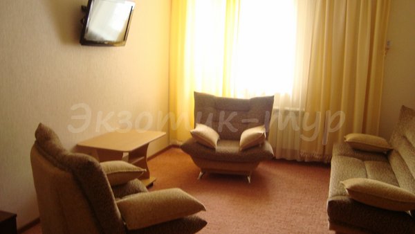 4-х местный 3-х комнатный Люкс. (1 номер). Две спальные комнаты и гостиная. В каждой спальной: двуспальная кровать, прикроватные тумбочки, стол, большое зеркало, шкаф для одежды, телевизор (спутниковое телевидение). В гостиной: мягкий диван, журнальный столик, стулья. В ванной комнате: душевая кабина, раковина, биде, санузел.Питание: