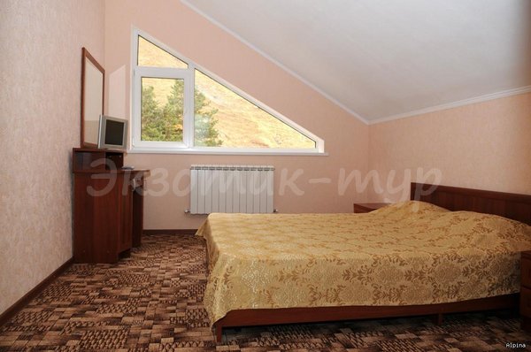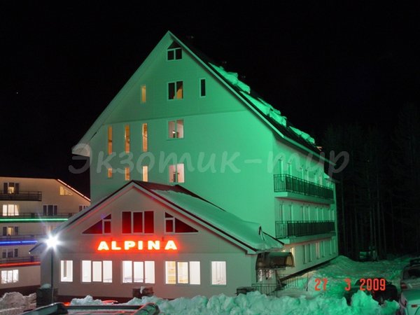 Отель « Альпина» единовременно может вместить 85 человек, номерной фонд насчитывает 39 номеров. Отель Альпин поражает своей красотой и месторасположением, именно поэтому она является очень популярной у любителей зимнего отдыха.Размещение: