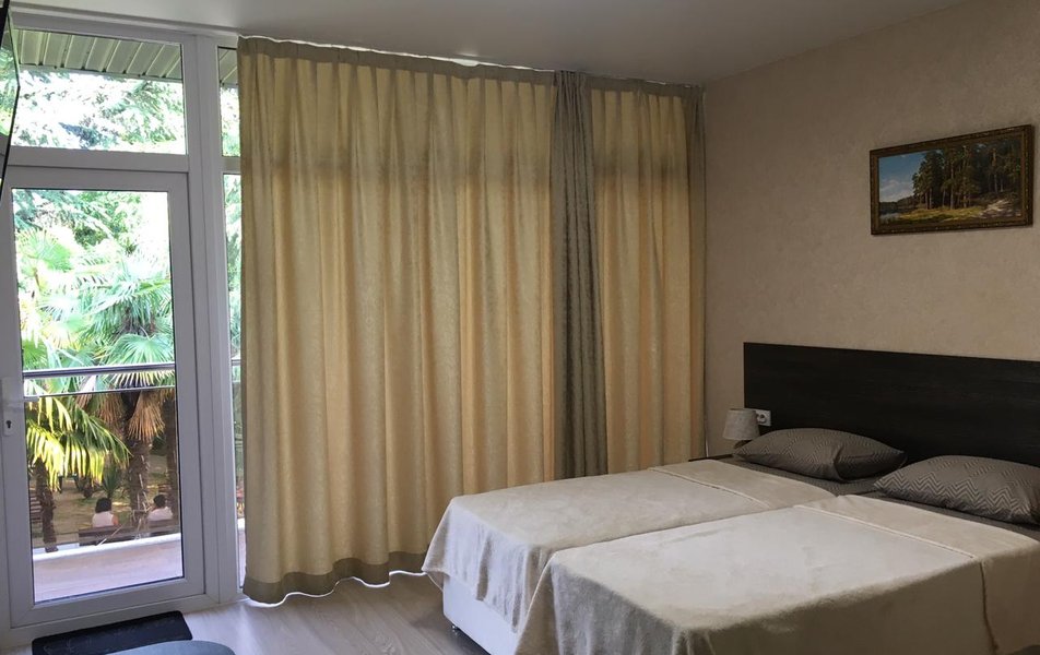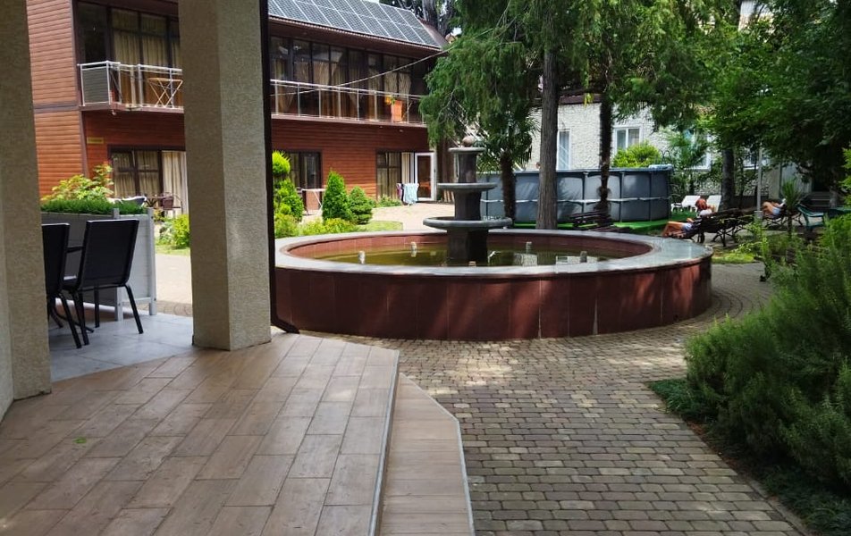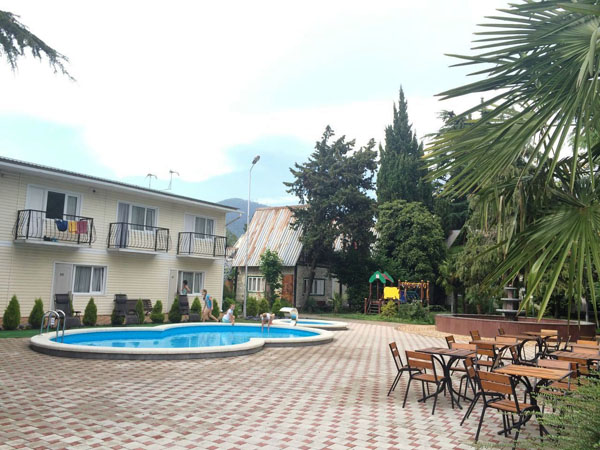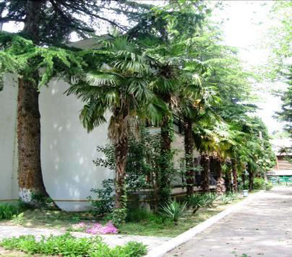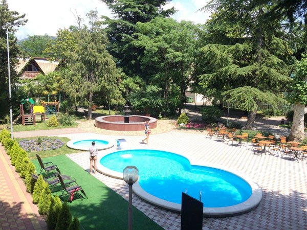 ухоженная территория пансионата с обилием клумб и субтропической растительности: пальмы, кипарисы, олеандры, магнолии. Есть места для отдыха, бассейн. Экскурсионные поездки, дельфинарии, океанариум, аквапарки, дольмены, водопады.Фото: