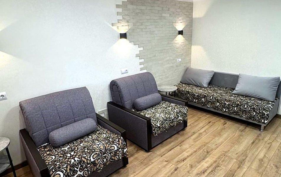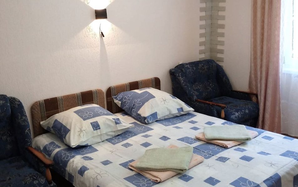 Номер 4-местный 2-комнатный в номере: диван раскладной, кровать двуспальная, прикроватные тумбочки, тумба, шкаф, кондиционер, телевизор. Санузел и душевые на территории во дворе. Апартаменты с кухней 4-местный диван раскладной, кресло-кровать: 2 , стол, стулья, шкаф.Мини-кухня Оборудование мини-холодильник , набор посуды, плита газовая, сплит-система, стиральная машина, телевизор, чайник, санузел с душем Сервис Wi-Fi бесплатно, смена полотенец, смена постельного белья, уборка номера