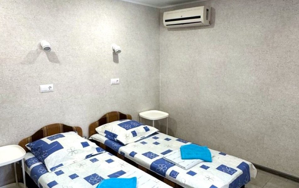 Номер 2-местный в номере: кровать двуспальная: либо 1-спальная кровать и диван, прикроватные тумбочки, шкаф, кондиционер, телевизор. Санузел и душевые на территории во дворе
